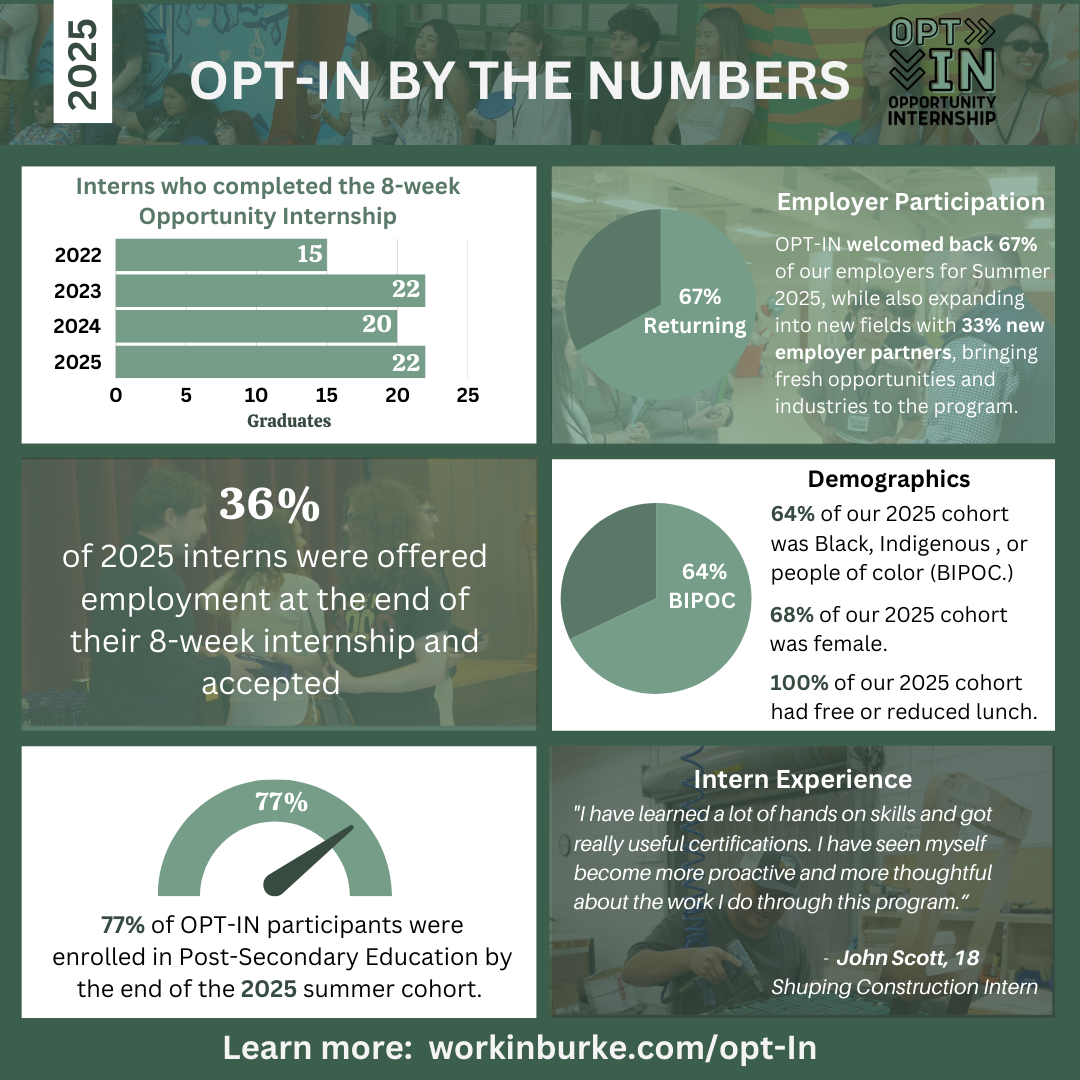 Opportunity Internship (OPT-IN) is an 8-week exploratory program for recently graduated high school seniors. This program begins in June (post high-school graduation) and involves 3 important pieces: Work Experience, Mentorship + Professional Development.